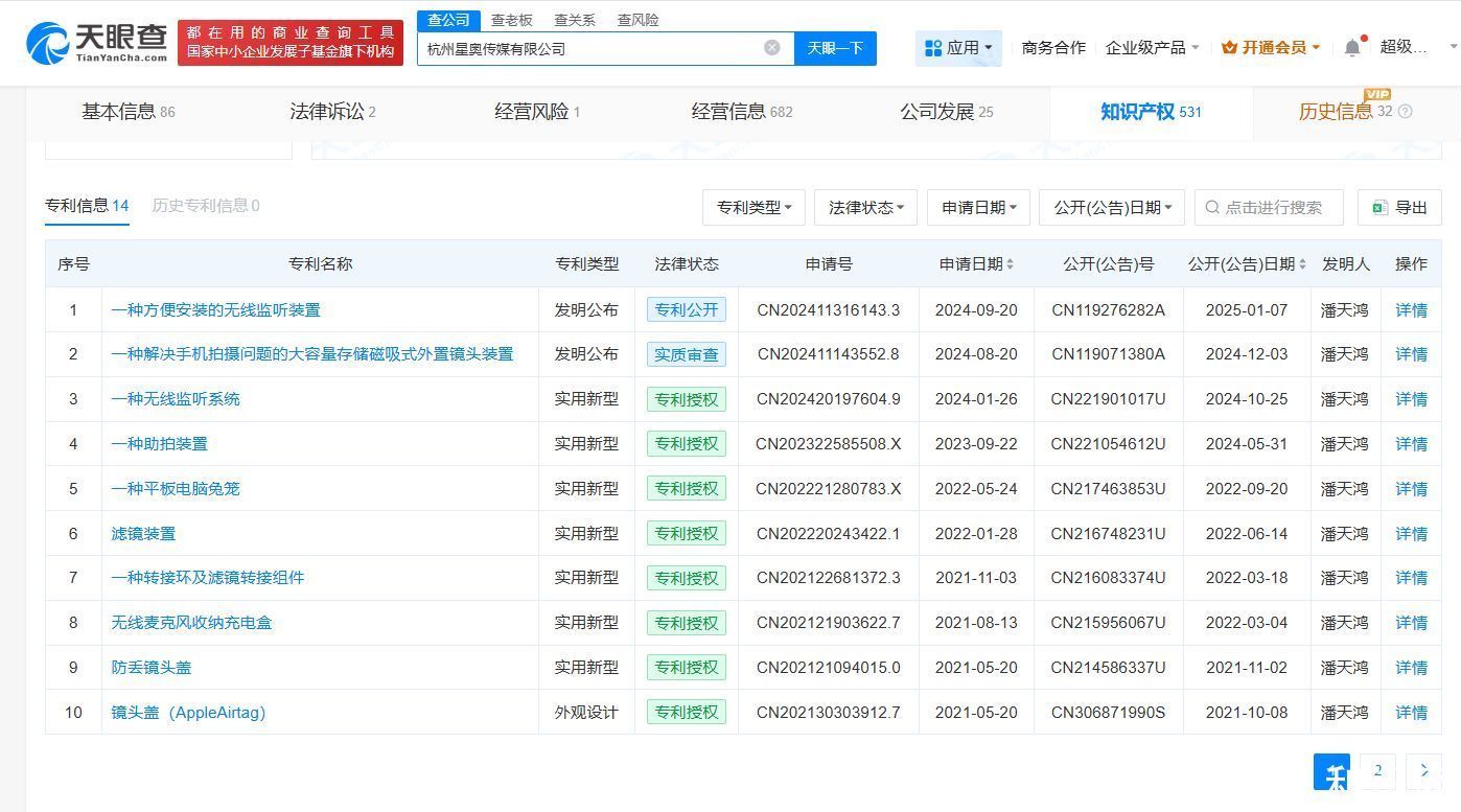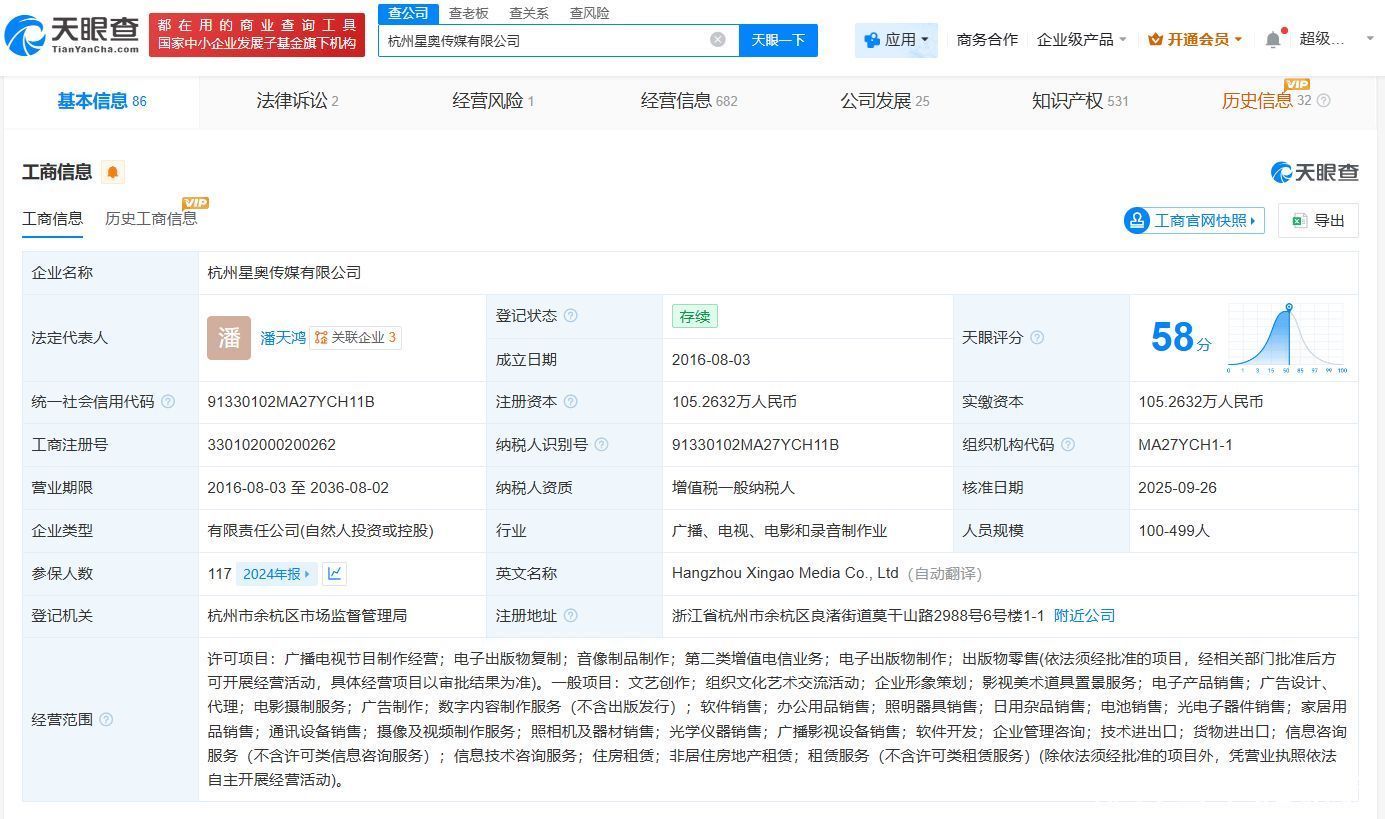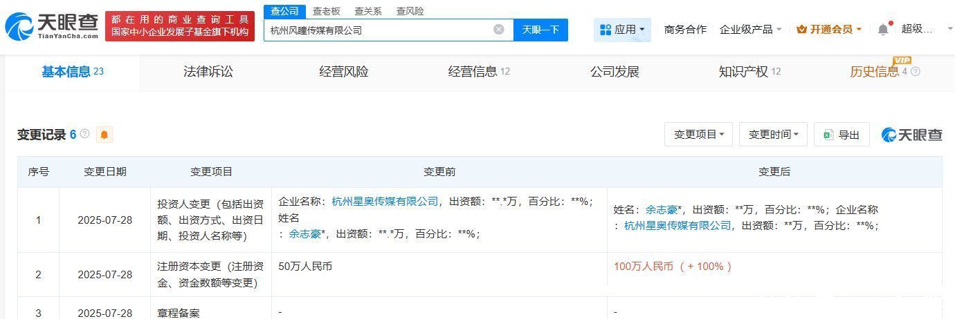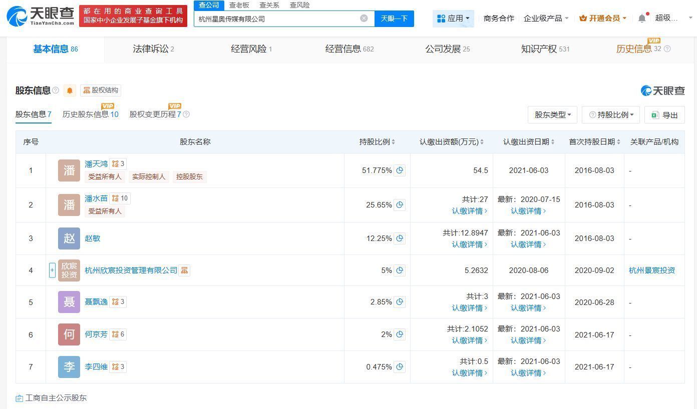天眼查App显示,影视飓风关联公司杭州星奥传媒有限公司成立于2016年8月,法定代表人为潘天鸿(Tim),注册资本约105万人民币,经营范围包括广播电视节目制作经营、电子出版物复制、电子产品销售等。股东信息显示,该公司由潘天鸿、潘水苗、赵敏等共同持股。对外投资信息显示上股票配资交流,该公司持有2家存续公司股份,其中杭州风瞳传媒有限公司注册资本于今年7月由50万人民币增至100万人民币。知识产权信息显示,该公司已申请多枚“影视飓风”“无限进步”等商标,并拥有多个专利。